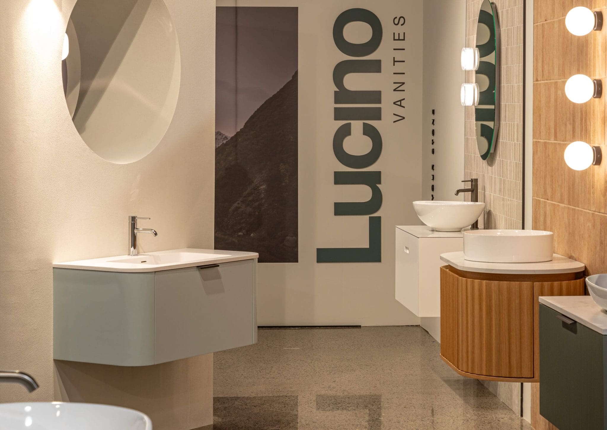 Lucino stone is renowned for its perfect blend of natural and man-made elements, delivering exceptional durability and a luxurious finish. The showroom design aimed to showcase Lucino’s premium stone vanities while encouraging visitors to explore creative mix-and-match options for fixtures, mirrors, and lighting.